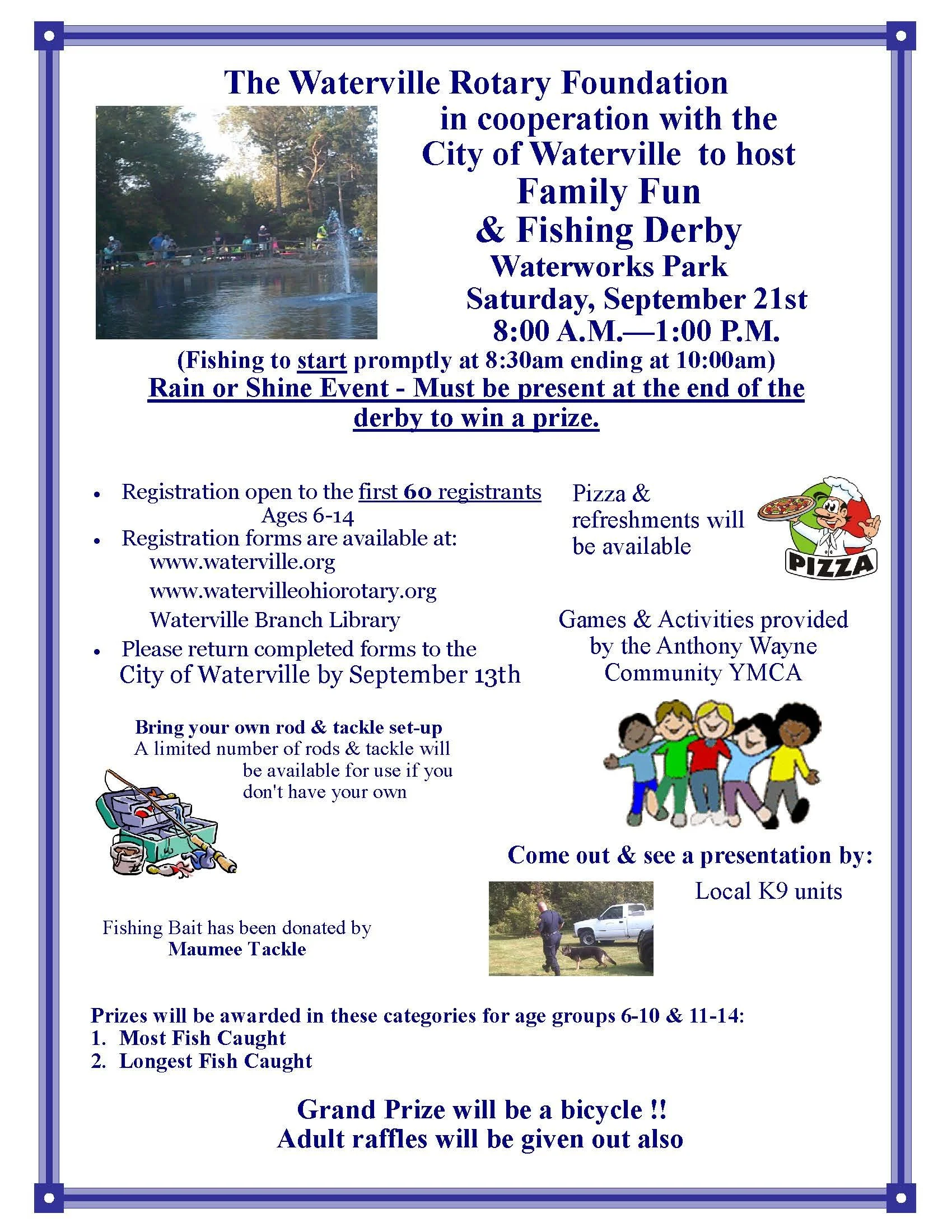 The Waterville Rotary Foundation in cooperation with the City of Waterville to host Family Fun & Fishing Derby Waterworks Park Saturday, September 21st 8:00am - 1:00pm.